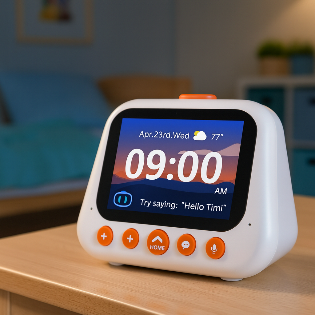 TimiClock™ to wyjątkowy budzik stworzony z myślą o dzieciach i ich codziennych potrzebach. To nie tylko zegar, ale także inteligentny towarzysz, który potrafi rozmawiać, odpowiadać na pytania i pomagać w nauce. Wystarczy jedno zdanie, aby ustawić alarm – dziecko mówi „Obudź mnie o 7:00”, a TimiClock™ zajmuje się resztą.